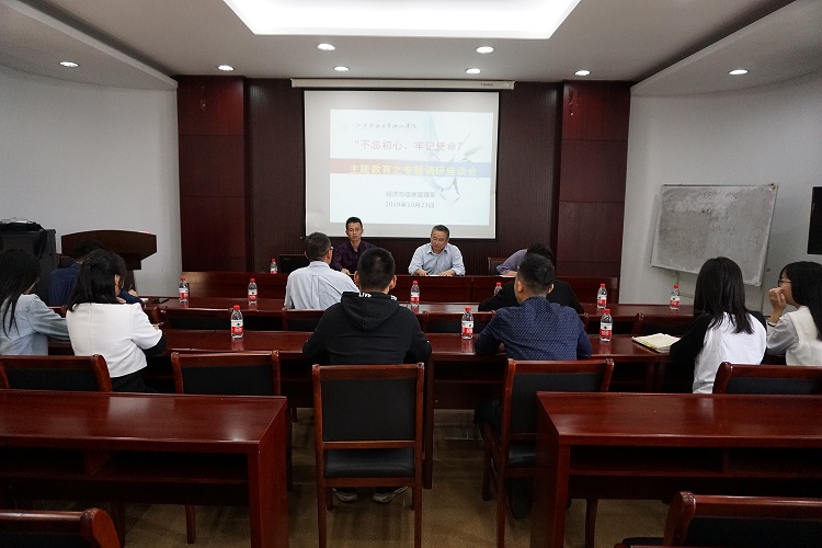 2019年10月23日下午,学院党委委员郑伟俊老师到经济与信息管理系,进行加强宣传思想政治工作的“不忘初心、牢记使命”主题调研座谈会。座谈会由经信系党总支副书记王明照老师主持,系主任芮廷先老师及部分师生代表参加了本次座谈会。党委宣传部、学生处(团委)等部门参与调研。