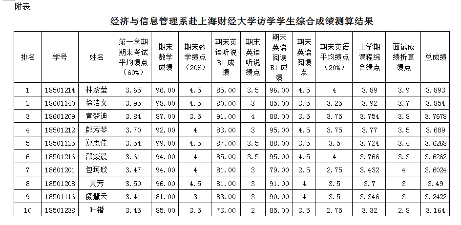 附表:经济与信息管理系赴上海财经大学访学学生综合成绩测算结果
