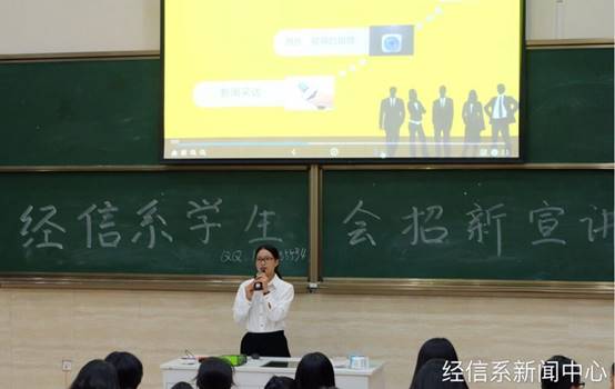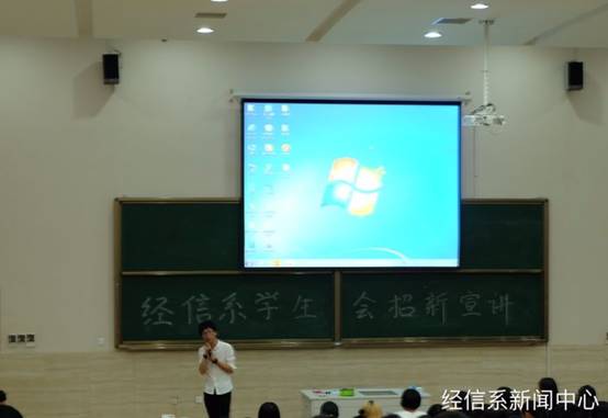 在主持人介绍了学生会部门设置后,由主席团成员沈昕发言,他告诉系里学生会做的是基础性建设,会更加使人得到锻炼,并且结合自己的真实感受希望同学们加入到这个大家庭中来。