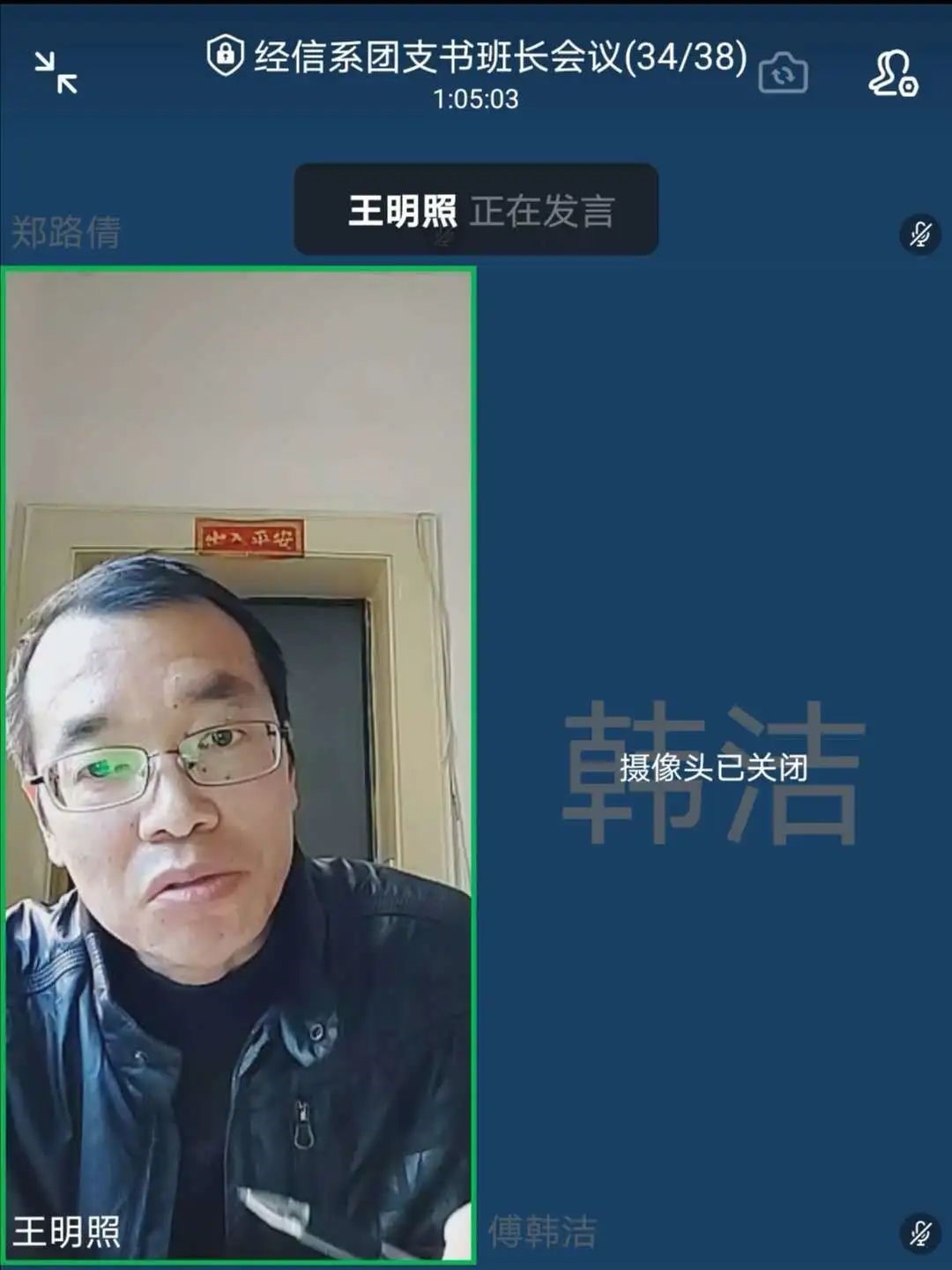 最后,郑路倩老师要求与会班长团支书继续配合学院做好各项班级工作,并认真把学院领导和系里老师的要求及时传达到每一位同学,并要求大家在接下来的线上教学过程中,继续保持沟通,共同维护学院各项工作的有序进行。