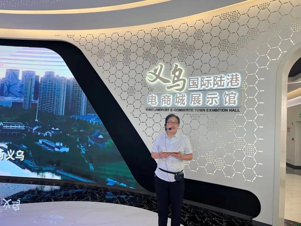 游学伊始,同学们参观了义乌陆港电商展示馆。通过视频宣传片、共享直播间、服务讲解等同学们了解了义乌陆港电商小镇的发展史、国际陆港电商城、义乌电商发展历程、产业生态布局及发展成效等方面内容。