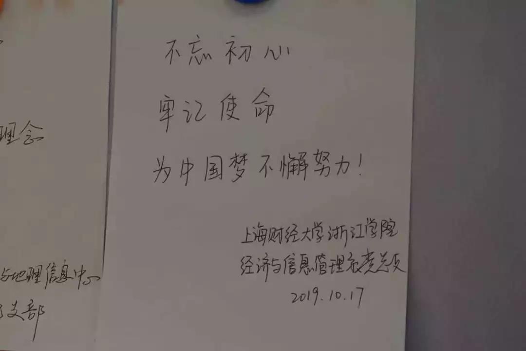 吴冰晴同志代表经信系全部成员在留言墙上留下“不忘初心 牢记使命 为中国梦不懈努力”的话语。