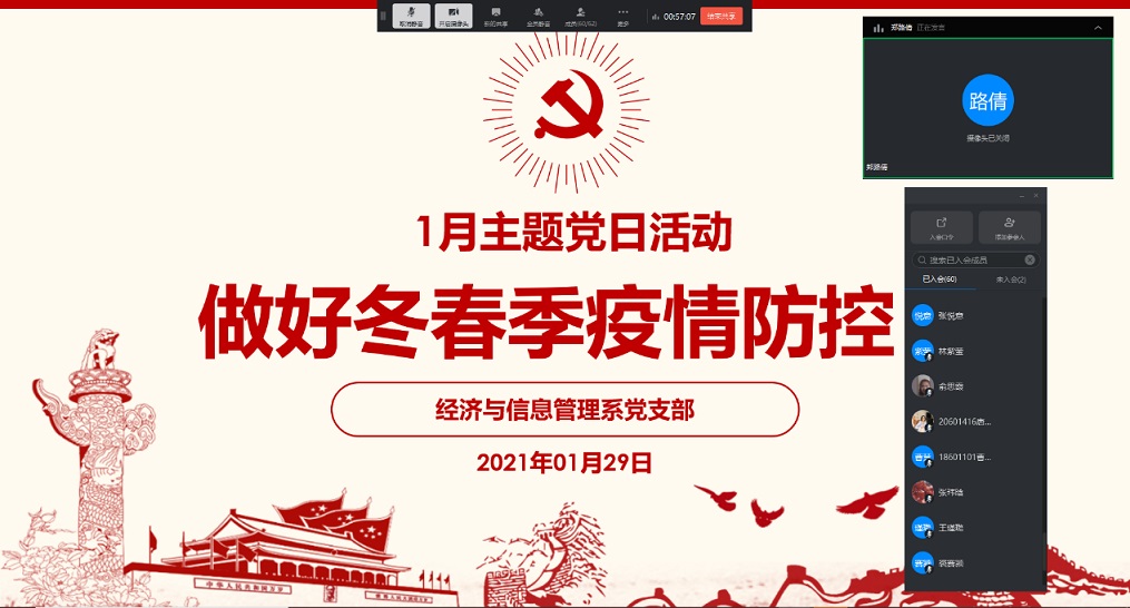 2021年1月29日20:00经济与信息管理系学生党支部在钉钉线上开展一月份党日活动,主题为“做好冬季疫情防控”。本次活动由学生党支部书记郑路倩老师主持,全体学生党员参与。