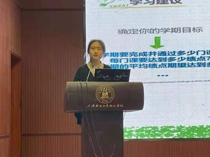 第二位演讲者金海艳以脚踏实地,行稳致远开篇,从学习,参与社会实践,参加竞赛活动,实习四个阶段来分享她的经验。她给同学们提了一些学习建议来提高学习的效率,并提出要适当奖励自己,然后分享了几款有助于同学们自律的软件;她还列举了自己的实践经历,提出了三点走走:多出寝室走走、出校门走走、出所在地走走;同时,她建议同学们:多关注,多了解;多尝试,多坚持。建议同学们要多多参加活动,丰富自己的阅历,“脚踏实地,行稳致远”。