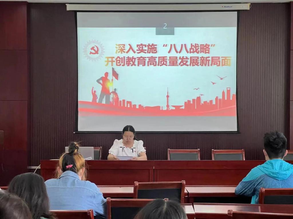 2023年5月30日13:20经济与信息管理系学生党支部在29-326开展五月份党日活动,主题为“深入实施‘八八战略’ 开创教育高质量发展新局面”。本次活动由上海财经大学浙江学院经济与信息管理系学生党支部书记贾丹老师、辅导员王志豪老师主持,全体学生党员参与。