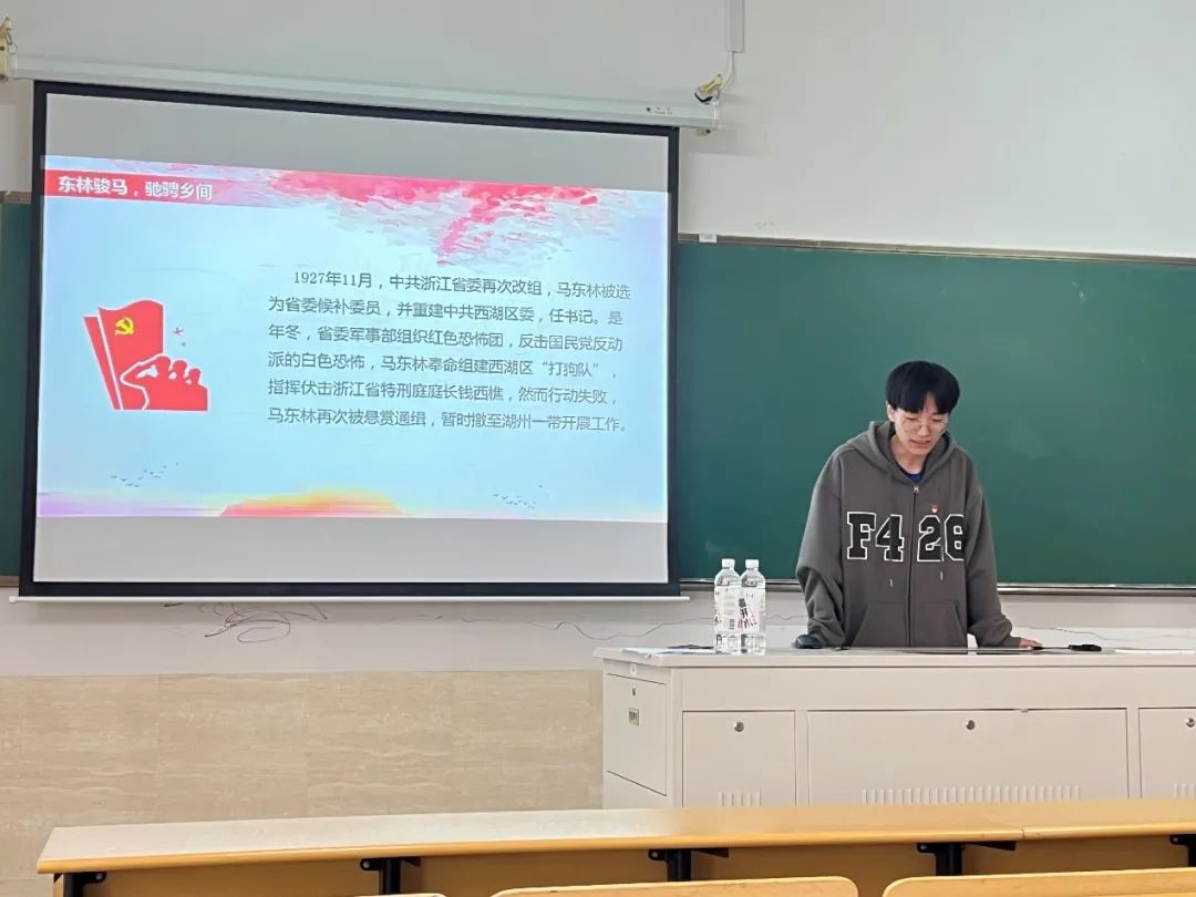 2023年5月24日12:45,经济与信息管理系学生党支部党员、入党积极分子开展了2022-2023学年第11、12节微党课,主讲人是中共预备党员郑宇同志。主要讲述了红色人物马东林的事迹。