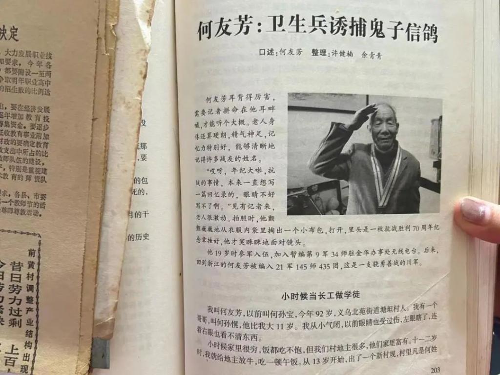 尽管何友芳爷爷已是百岁高龄,但他的身体还是十分硬朗,和志愿者们交流时声音中气十足。讲到激动处,爷爷还拿出金华市抗战老兵名录和几十年前的旧报纸等向志愿者们展示。