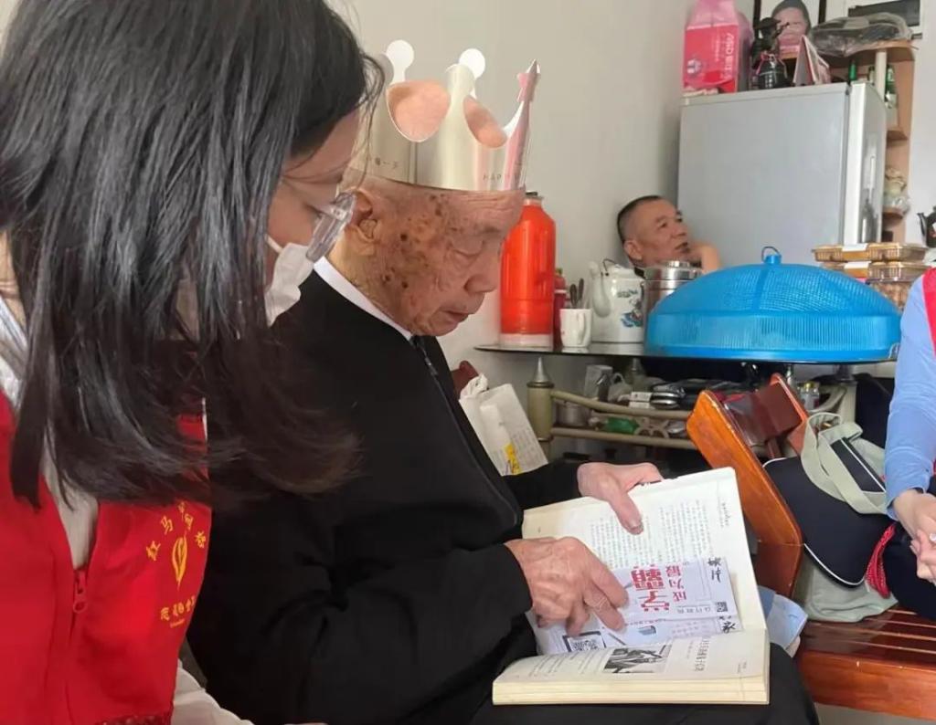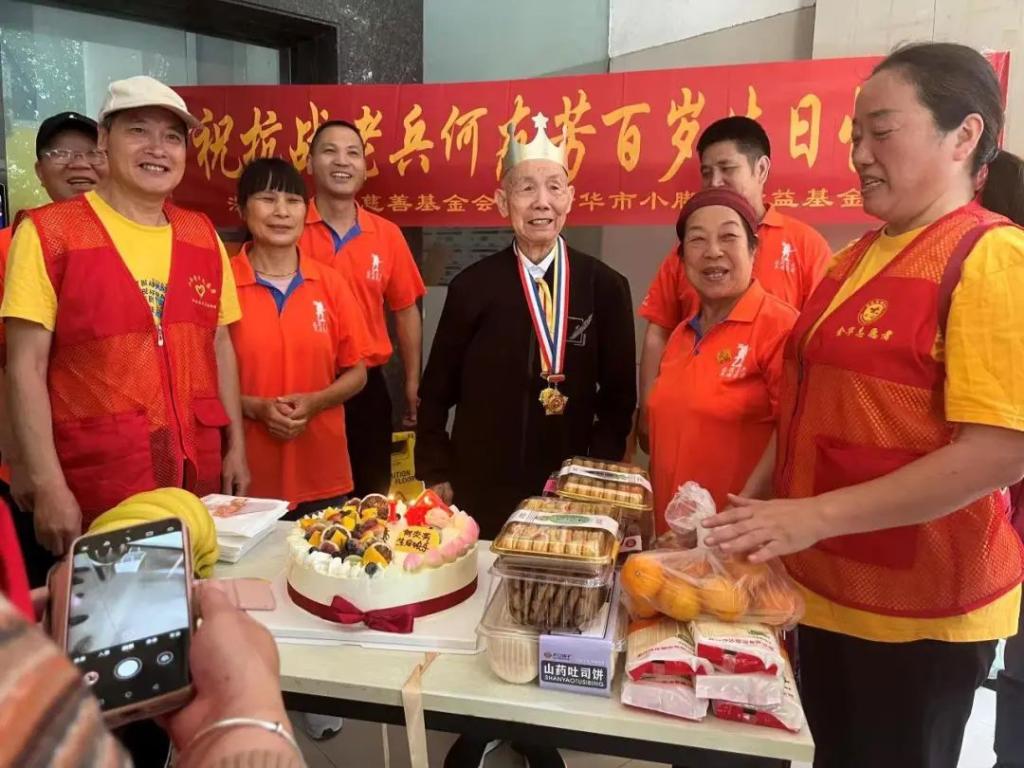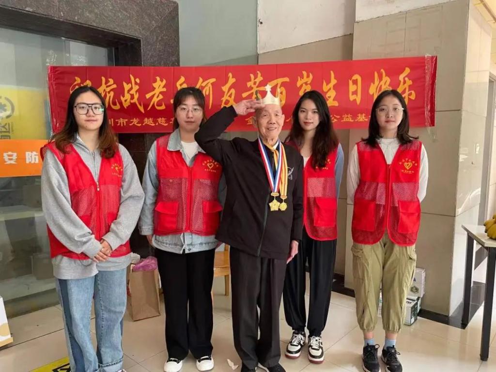 2023年5月14日上午,经济与信息管理系学生党支部部分党员与我系向阳花志愿队一同拜访了抗战老兵何友芳爷爷,和金华市小脚丫公益基金会一起为爷爷庆祝他的百岁生日。