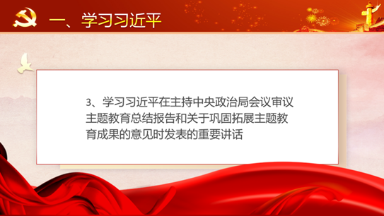 三、组织学习习近平在主持中央政治局会议审议主题教育总结报告和关于巩固拓展主题教育成果的意见时发表的重要讲话