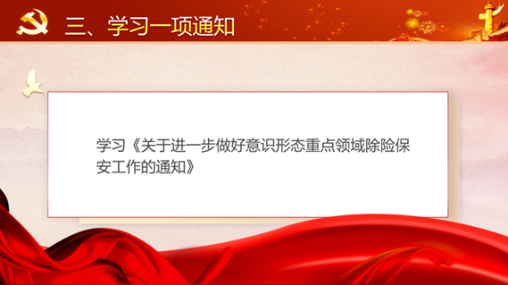 六、组织学习《关于进一步做好意识形态重点领域除险保安工作的通知》