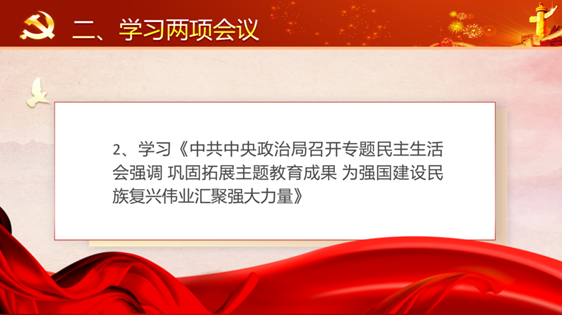 六、组织学习《中共中央政治局召开专题民主生活会强调 巩固拓展主题教育成果 为强国建设民族复兴伟业汇聚强大力量》
