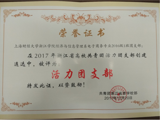 近日,2017年度浙江省高校共青团“活力团支部”创建遴选结果公布,我系16级电子商务一班荣获2017年浙江度浙江省高校共青团“活力团支部”称号。
