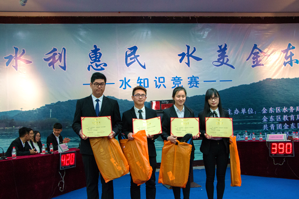 为纪念第二十五届“世界水日”,第三十届“中国水周”,并进一步加强同学们的爱水、惜水、节水、护水意识,3月22日,由金东区水务局、金东区教育局、共青团金东区委员会联合主办的“水利惠民,水美金东”水知识竞赛在我院图书馆报告厅隆重举行,我系学生吴小华、黄梦迪、李涛明和工商管理系学生陈涛组成的代表队喜获第二名。