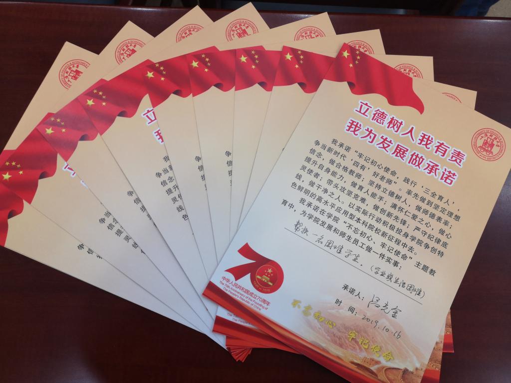 最后,王明照老师总结发言。鼓励各位参会教师立师德、正师风,严守师德底线,做好学生榜样。全体教师党员签订了“立德树人我有责、我为发展做承诺”协议书,承诺为学院发展和师生员工做一件实事。