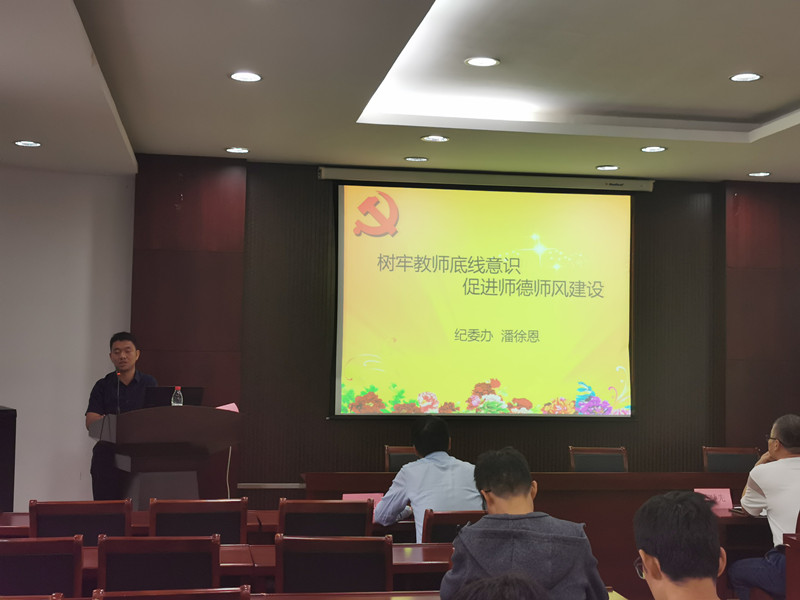 最后,纪委办负责人潘徐恩以“树牢教师底线意识 促进师德师风建设”为主题,从教师的“四个底线”、学院师德师风工作开展情况和校园常见的师德师风问题三个方面,向全体教职工普及了师德师风相关知识,并通过详实的案例解析了各类常见师德师风问题,以鲜活的事实依据为在座教职工敲响了警钟。他指出,教师应牢守法律底线、纪律底线、制度底线、道德底线四个底线,严格遵守教育部的“六个严禁”、《新时代高校教师职业行为十项准则》与学院师德师风相关制度规定,明晰师德师风问题特征,杜绝高校各类常见的师德师风问题。