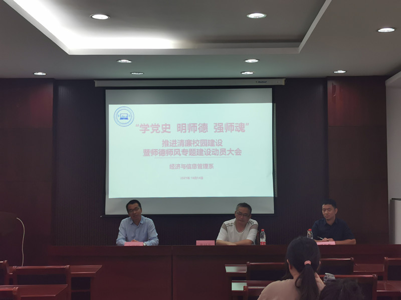10月14日下午,经济与信息管理系在行政楼29幢326会议室举行题为“学党史 明师德 强师魂”的推进清廉校园建设暨师德师风专题建设动员大会。动员大会由系党总支副书记王明照主持会议,经济与信息管理系全体教职工参加了本次会议,会议邀请学院纪委办负责人潘徐恩作师德师风主题讲座。