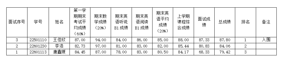 注:总成绩=(第一学期期末考试平均成绩*60%+期末数学成绩*20%+期末英语成绩*20%)*70%+专家面试成绩*30%