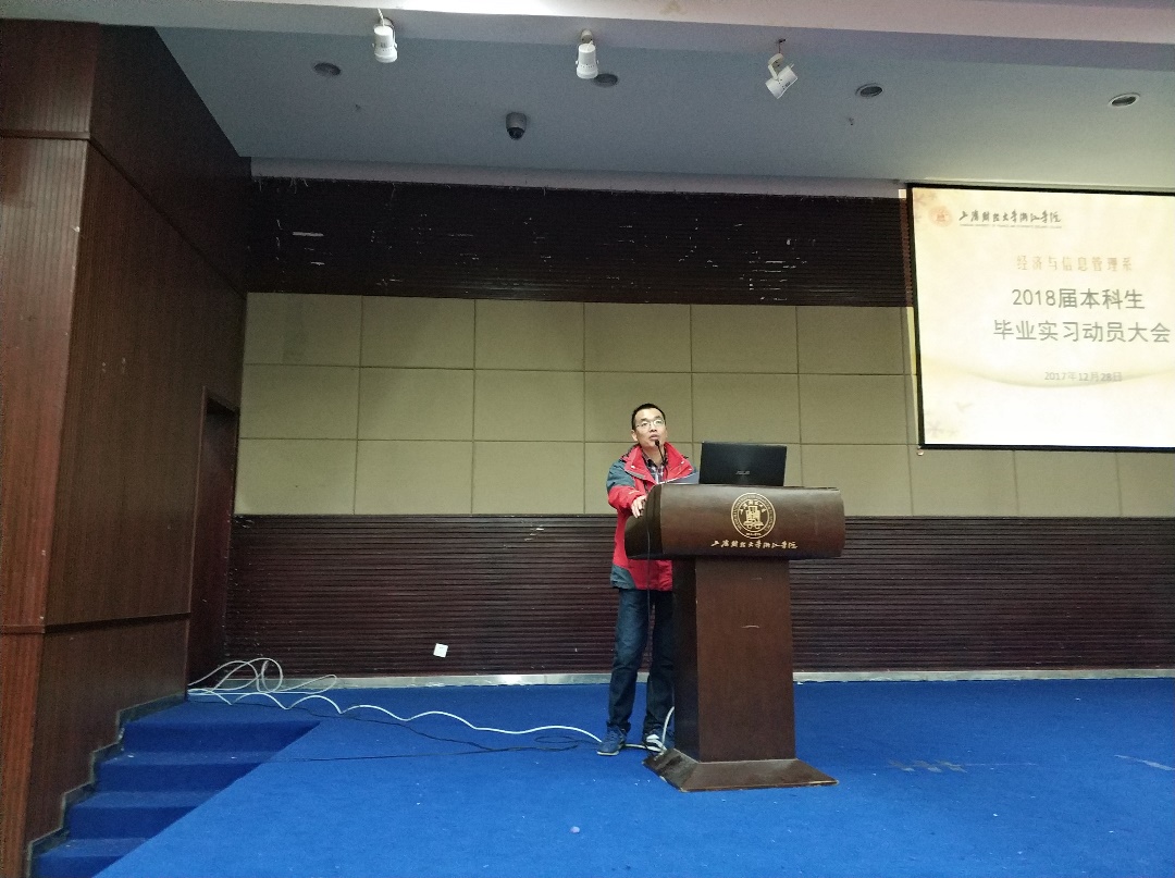 12月28日中午,经济与信息管理系在图书馆报告厅举行2018届毕业实习动员大会,系主任芮廷先、系总支副书记王明照及相关老师和2018届体全学生参加了本次动员会,会议由辅导员王瑞贺主持。
