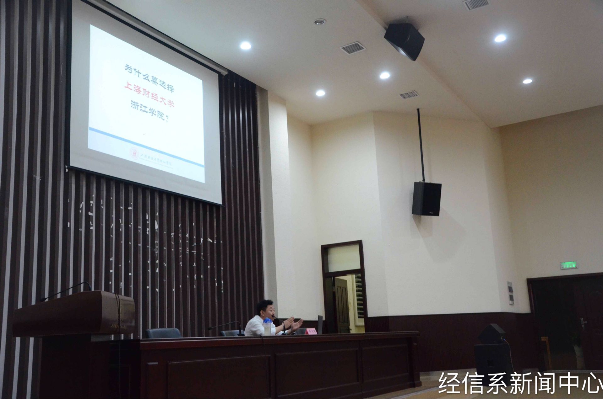 他着重强调了“上海财经大学”,向同学们展示了品牌效应对生活中的影响,并用自身的理解阐述了经信系专业的本质,并由此展开了一系列讲解。